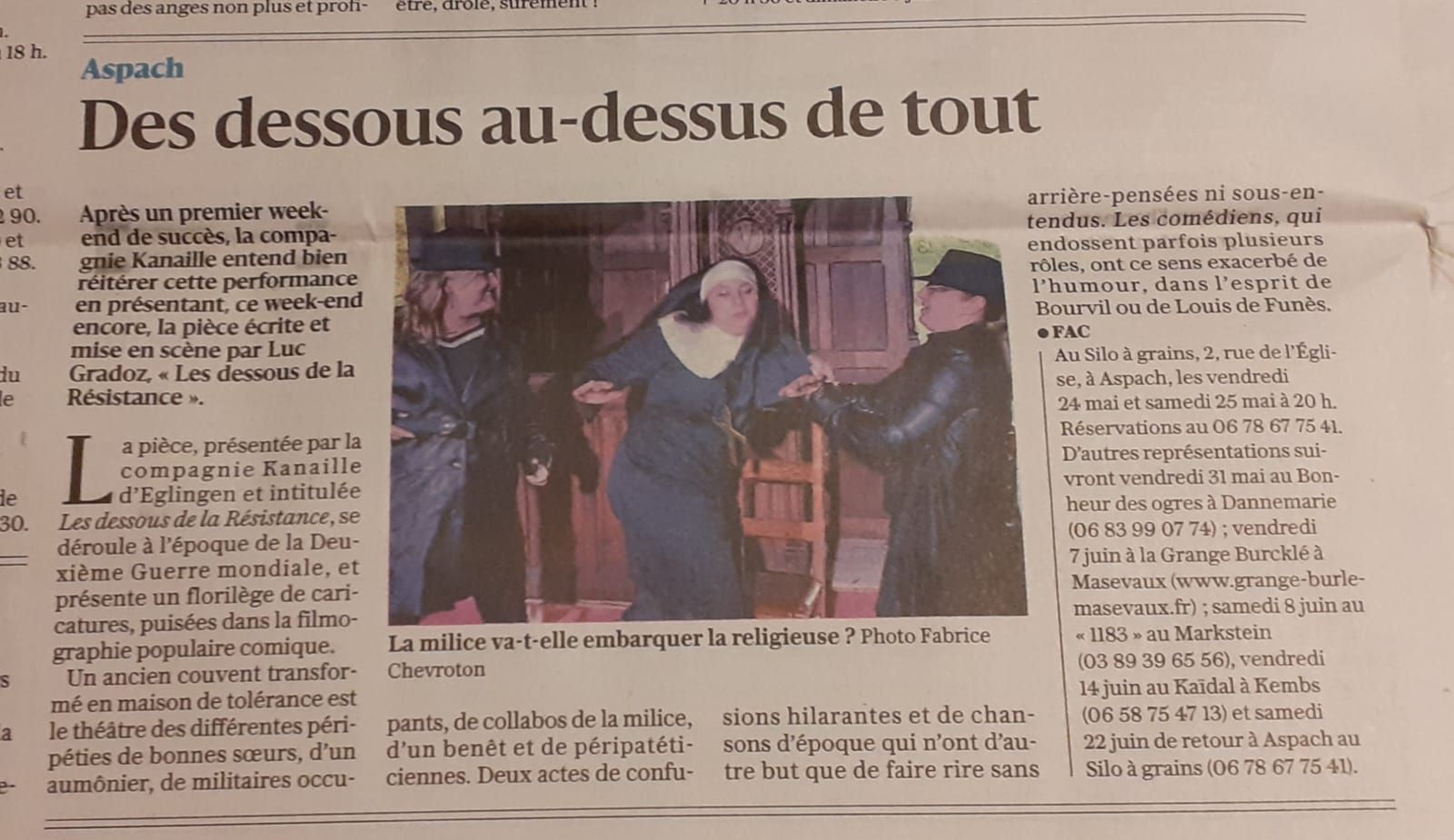 Très belle première pour la Compagnie Canaille hier soir. Il s'en passe des vertes et des pas mûres dans ce bor... couvent, quand " Papy fait de la résistance" croise la " Grande Vadrouille " la traversée de Paris n'est pas très loin d'attirer un Harry Potter, ainsi qu'un soupçon de Star Wars ... OK, " je prends la porte "